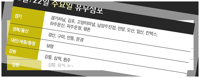 2주차와 4주차 수요일인 4월 8일과 4월 22일에 휴무일을 갖는 지점들도 있다. 경기지역에는 경기 하남점, 김포점, 고양터미널점, 남양주진점, 안냥점, 오산점, 일산점, 킨텏점, 파주문산점, 파주운정점, 평촌점이 있다. 경북/울산 지역에는 경산점, 구미점, 안동점, 문경점들이 있다. 그 외에도 보령점과 강름점, 삼척점, 원주점도 해당날짜에 휴무일을 갖는다. 아무래도 서울 외의 지역에 사는 사람들은 자신의 매장이 언제 쉬는지 따로 확인이 필요할 것으로 보인다.