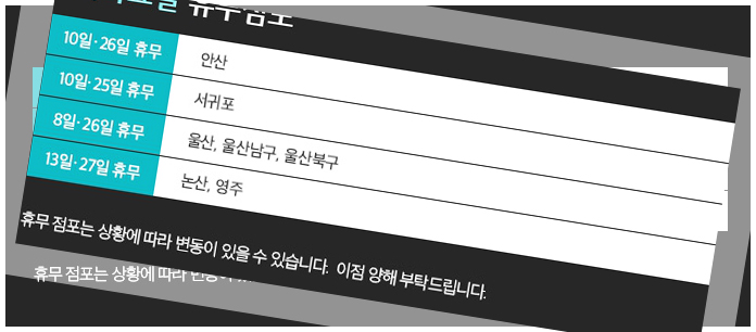 조금 특이하게 쉬는 지점들도 있다. 바로 2주차 수요일과 4주차 일요일에 휴무일을 갖는 지점들이다. 즉 4월 8일과 4월 26일 휴무일을 갖는 지점들로 우산점, 울산남구점, 울산북구점이 여기에 해당한다. 울산지역 한정으로 이러한 휴무일이 지정되어 있는데 아무래도 지역적인 특성이 반영되어 해당 날짜에 휴무일이 지정되어 있는 것으로 보인다. 근데 조금 헷갈릴듯 하다…