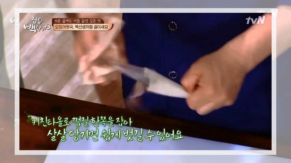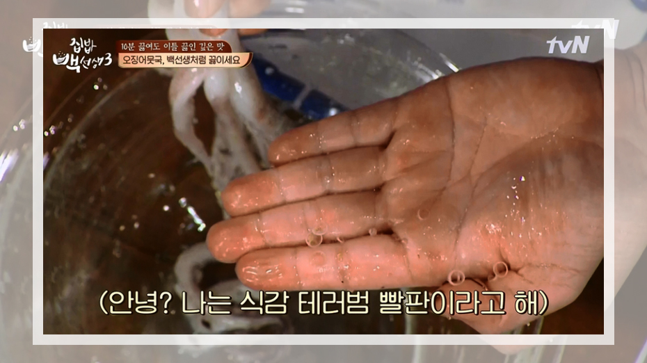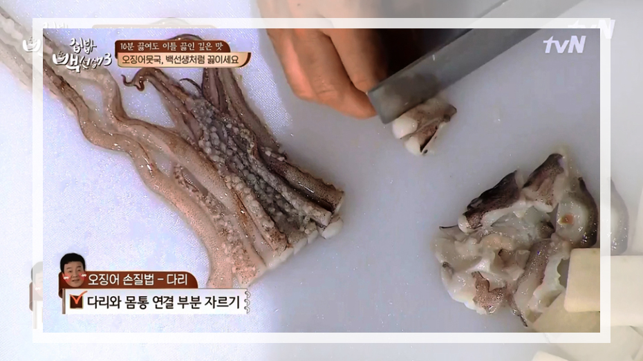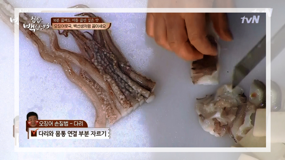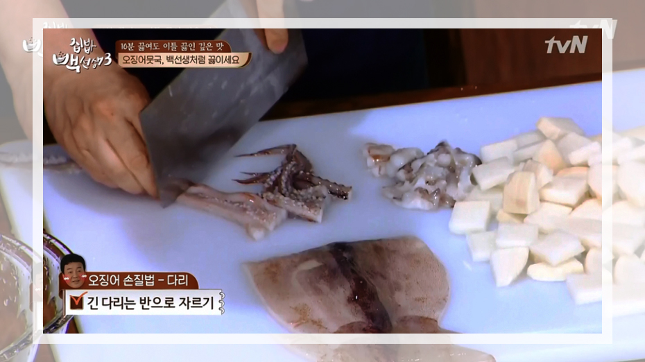백선생 오징어무국 황금레시피를 본격적으로 시작해보겠다. 첫번째로는 각 재료들을 손질해 주는 과정이 필요하다 오징어의 경우 조금은 까다로운 손질법을 요구한다. 오징어의 다리에 붙어있는 빨판들이 있는데 손으로 다리를 감싼 후 아래쪽으로 쭉 당겨서 이 빨판을 제거해줘야 한다. 동그란 잔여물같은게 손에 뭍어 나오는데 그녀석들이 바로 오징어 빨판이다. 다리 하나하나 깔끔하게 빨판을 제거해야 나중에 식감을 헤치지 않는다.