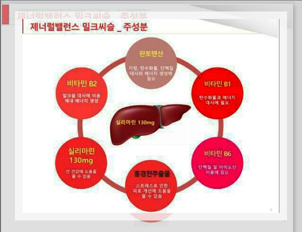 밀크씨슬에 함유되어있는 성분중 가장 대표할만한 것은 바로 실리마린이라는 성분일 것이다. 이 성분은 플로보노이드라고 하는 성분의 일종인데, 이 성분이 바로 해독과 소염작용을 일으키는 성분이라고 한다. 즉 간에 쌓이는 독들을 해독시키면서도 간의 건강을 회복시키는 역할을 수행한다.