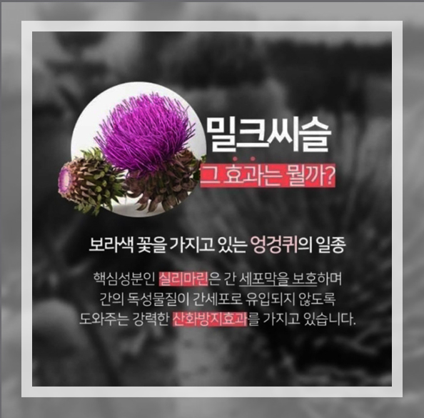 오늘은 간겅강을 위해 많이 찾게 되는 밀크씨슬에 대한 효능정보와 부작용에 대한 프스팅을 이어가보려고 한다. 밀크씨슬은 함유하고 있는 성분이 황산화작용에 너무 뛰어난 효능을 가지고 있어 오래전부터 국내에서 사용되오던 약재이다.
