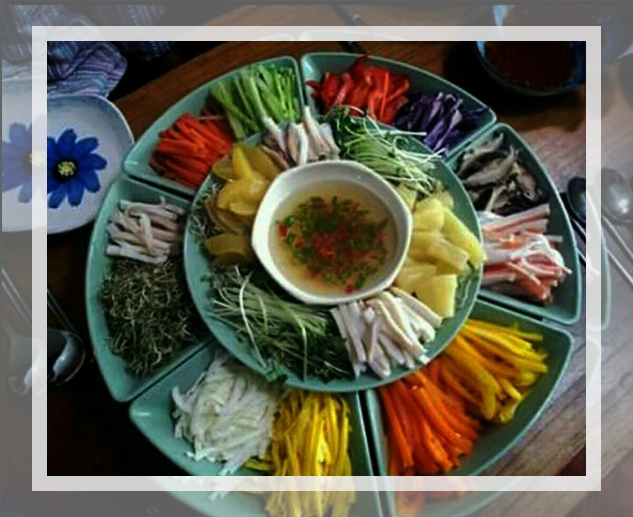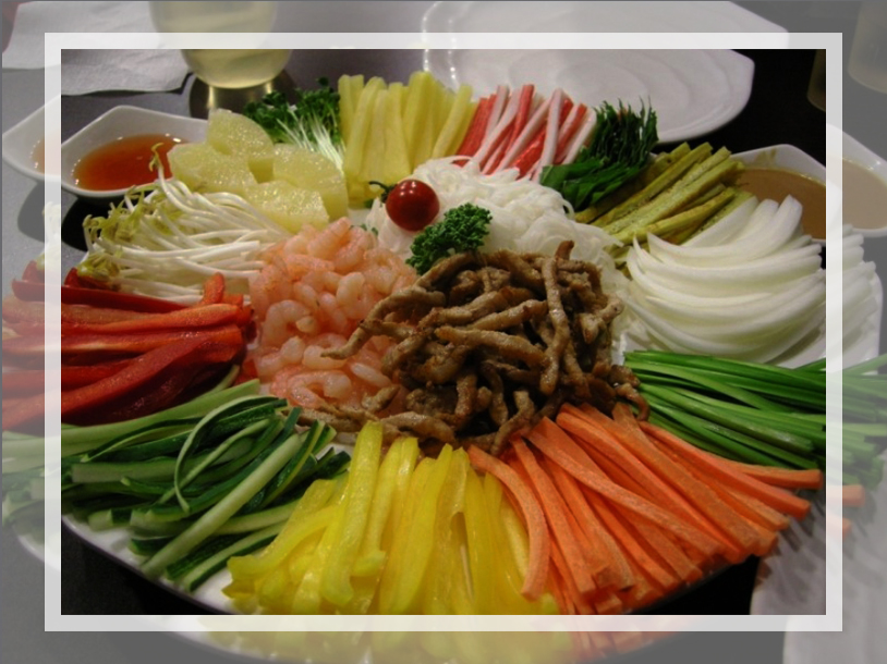 그래도 대표격으로 사용되는 월남쌈 재료를 살펴보자면 파프리카, 맛살, 파인애플, 칵테일새우, 돼지고기, 당근, 양파, 오이, 깻잎, 오리고기, 참치캔, 불고기, 양상추, 토마토, 부추, 팽이버섯 등등이 주로 사용되고 있습니다. 물론 흔하게 접하게 되는 재료일 뿐 정해져있는 것은 없다.