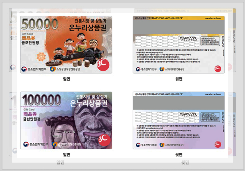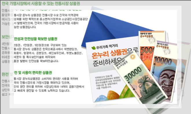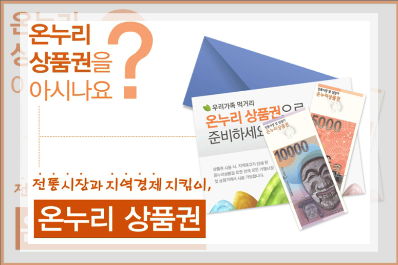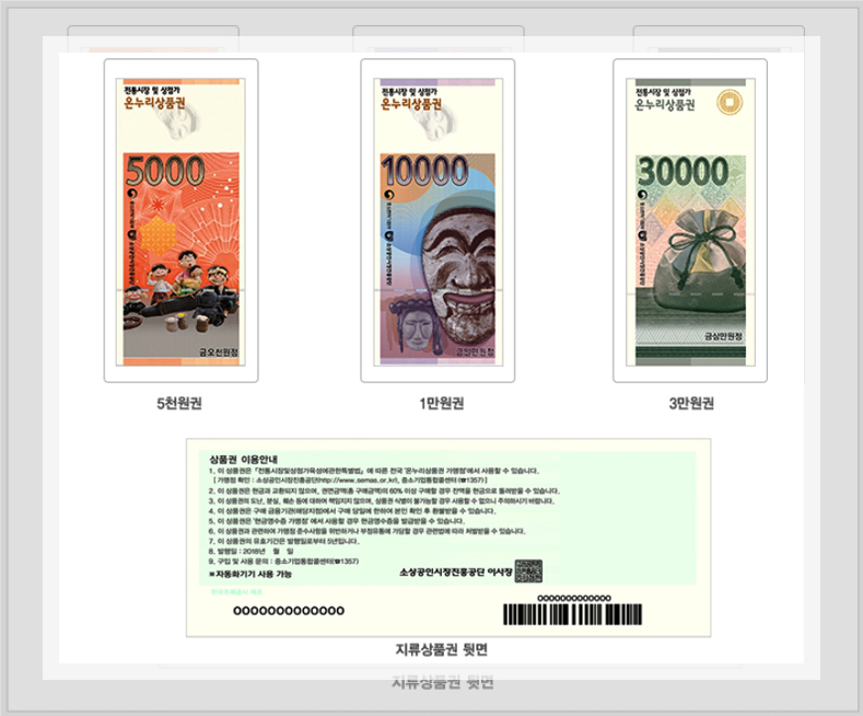 2009년에 발매된 온누리상품권은 가맹점을 통해서 사용할 수 있는데 현금처럼 사용이 가능하다. 5천원권과 1만원권은 물론이고 전자상품권의 형태로도 유지되고 있는 상품권이다. 1인당 월에 30만원까지 구매가 가능하며 사용금액이 60%를 넘어야 잔돈을 받을 수 있다.