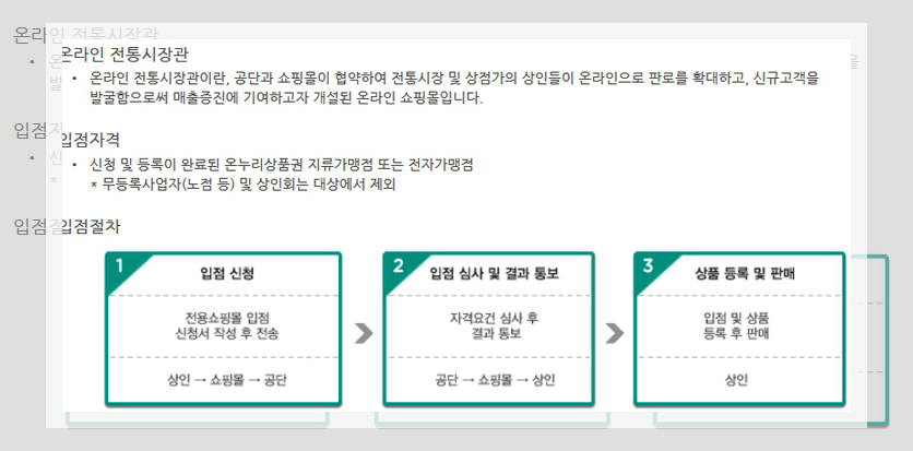 이런 불편한 점을 고려하여 전통시장통통이라는 사이트가 존재한다. 해당 사이트에서는 본인이 방문하고자 하는 시장의 이름, 점포명, 지역단위로 설정을 한 다음 나타나는 목록과 지도를 통해서 온누리상품권 사용처를 간편하게 알아볼 수 있다.