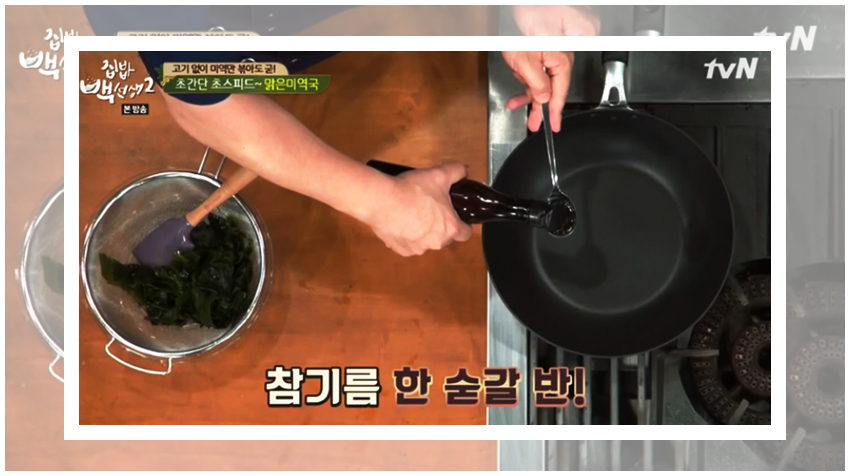 미역이 모두 불었다면 이제 본격적인 미역국 맛있게 끓이는 법 과정이 시작된다. 백종원 미역국 레시피에서는 미역을 볶아서 사용해준다. 우선 미역을 참기름 1.5큰술과 함께 중불에서 볶아준다. 이 때 오래 볶을 필요 없이 참기름이 미역에 고루 묻었다는 느낌이 들 정도로만 볶아주면 충분하다.