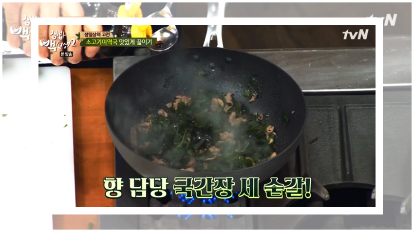 참기름에 미역을 1차적으로 볶아줬다면 국간장을 넣어주면서 볶아준다. 이때 국간장은 그냥 넣지 말고 국간장을 팬에 둘러서 눌게끔 기다렸다가 볶아줘야 한다. 그래야 간장의 풍미가 확 살아나면서 미역국에 감칠맛을 더한다. 국장 2큰술을 2번으로 나눠서 해주기를 추천한다.
