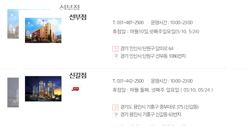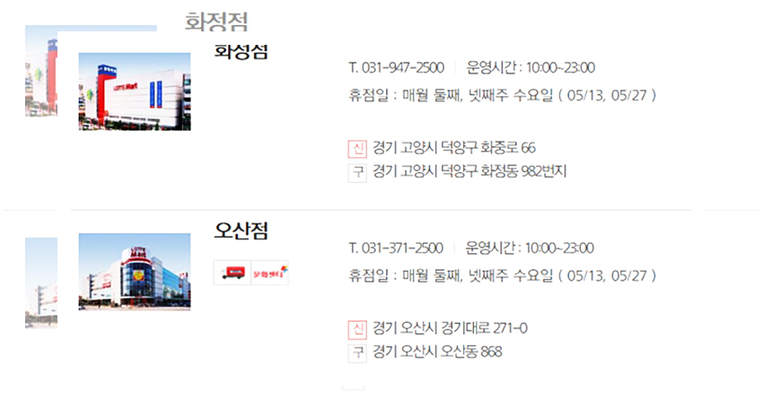 이번에는 2주 차와 4주 차 수요일에 휴무일을 갖는 롯데마트 매장들을 살펴보겠다. 5월 날짜로 본다면 5월 13일과 5월 27일인데 이 날짜에 휴무일을 갖는 롯데마트 매장들이 생각보다 많으니 꼭 확인해 보기를 바란다.