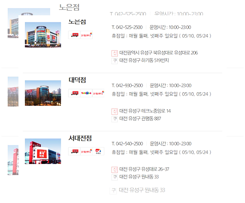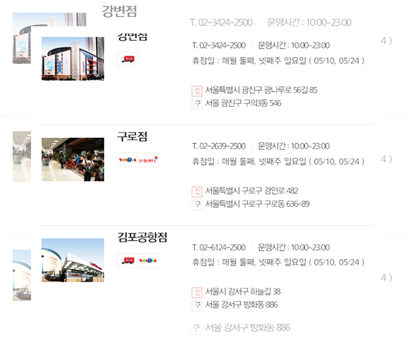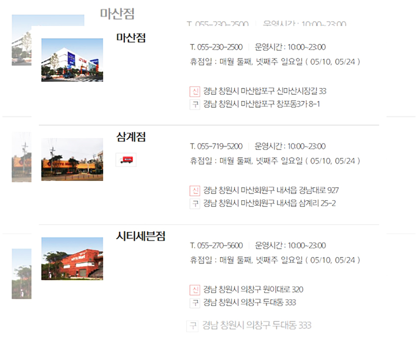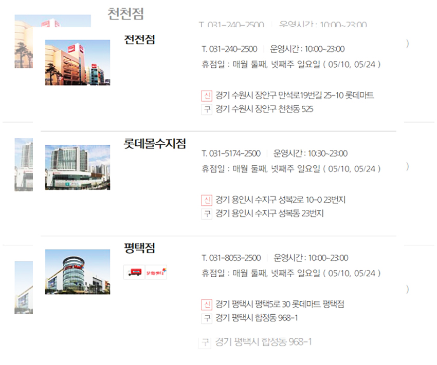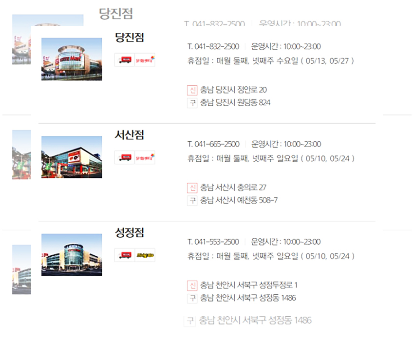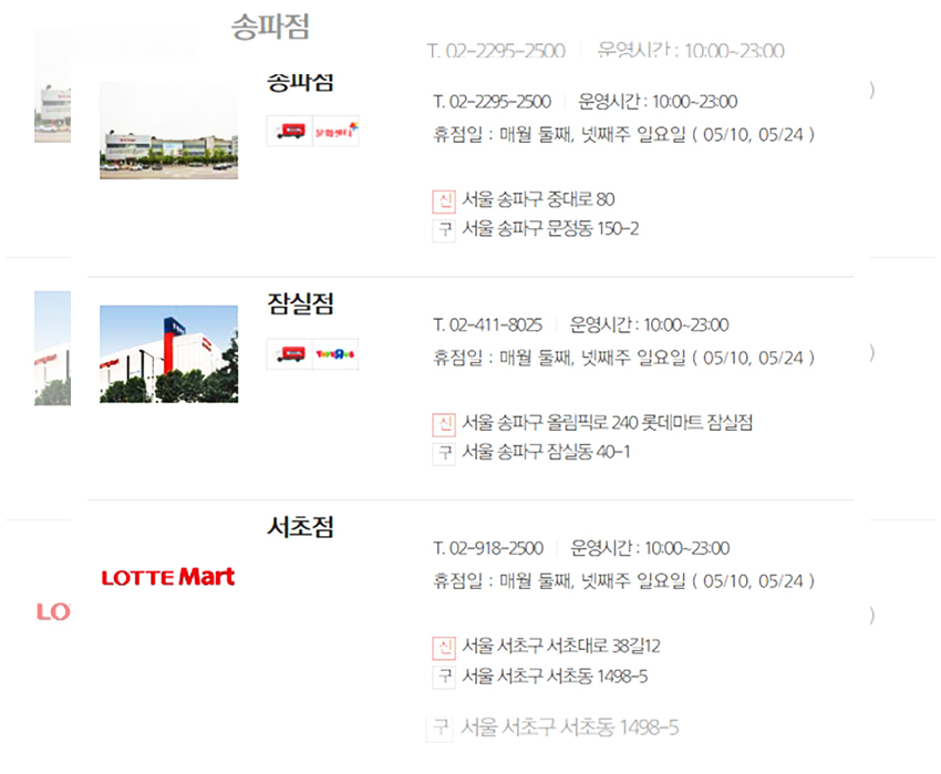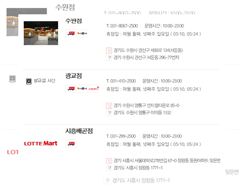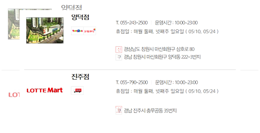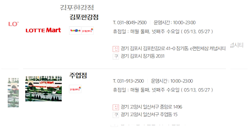 생각 같아서는 모든 매장들이 동일한 날에 휴무일을 가졌으면 좋겠지만 아쉽게도 롯데마트는 각 지역의 환경과 지역적인 특성들이 고려되어 상이한 휴무일을 갖는다. 우선은 정기휴무일인 5월 10일과 5월 24일에 휴무일을 갖는 매장들을 먼저 안내하겠다.