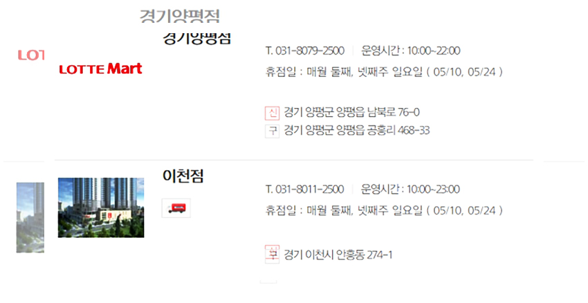그럼 해당 날짜에 휴무일을 갖는 롯데마트 매장들을 알아보겠다. 우선 서울지역에서는 행당역점만이 유일하게 5월 13일과 5월 27일에 휴무일을 갖는다. 경기지역에는 의왕점, 주엽점, 구리점, 화정점, 오산점, 동두천점, 덕소점, 고양점, 김포한강점, 양주점, 마석점들이 있다. 인천지역에는 2주차와 4주차 수요일에 휴무일을 갖는 매장이 없다.