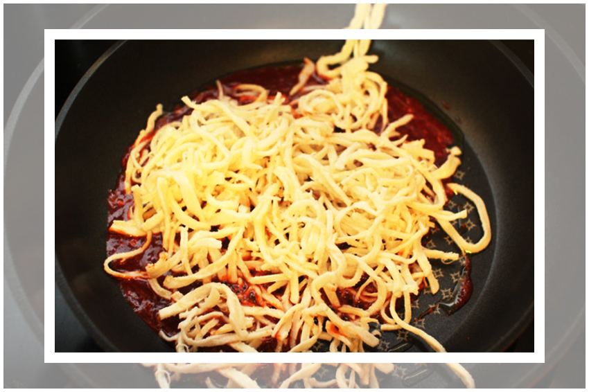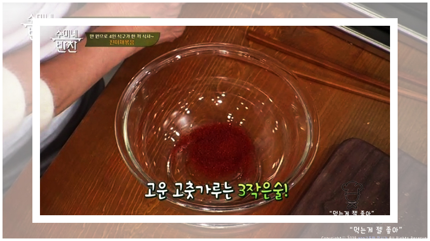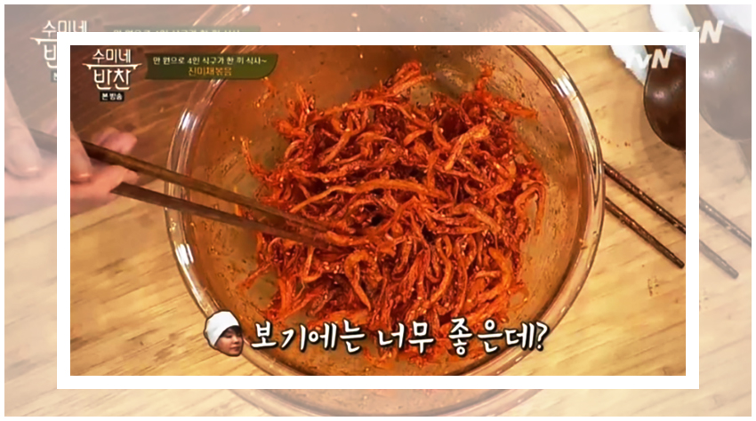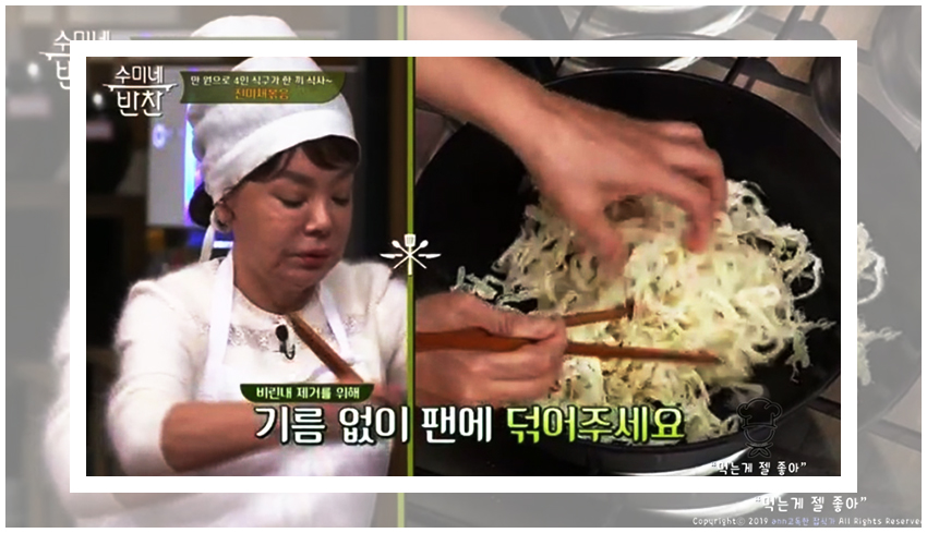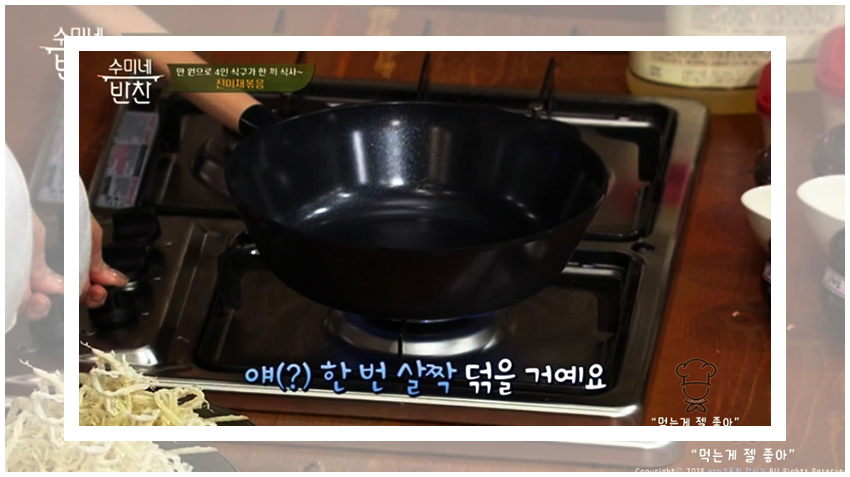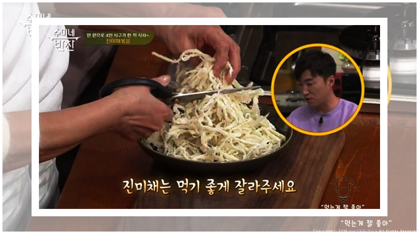 수미네반찬 진미채볶음 황금레시피의 조리과정은 정말 간단하다. 우선은 진미채를 물기가 완벽히 제거된 팬에서 볶아준다. 진미채를 볶아주면 비린 맛을 조금 잡아주면서도 감칠맛이 극대화된다고 한다. 유의할 점은 절대 센 불에 해서는 안된다는 것이다.