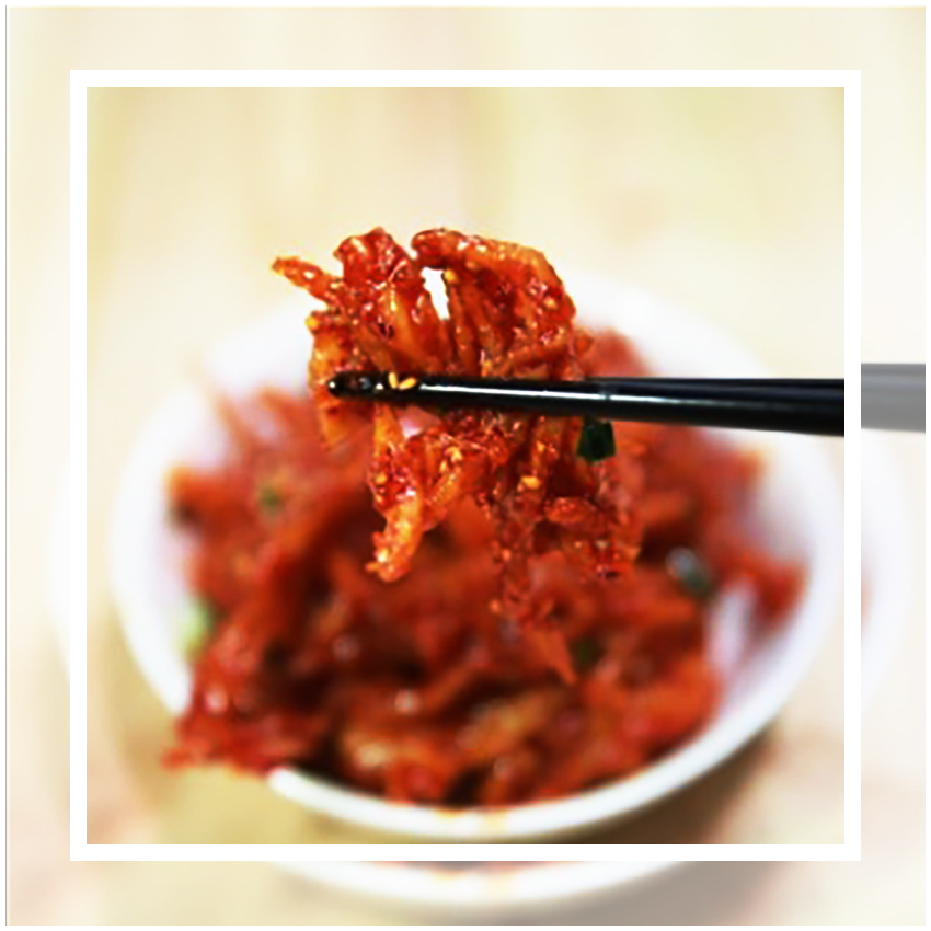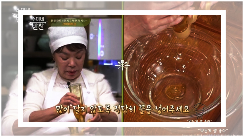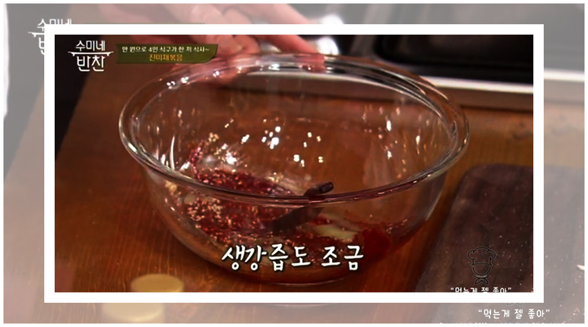 생강즙이 양념재료로 들어가는 것에 의문인 분들이 계시리라 생각이 든다. 진미채를 생으로 먹어본 사람들을 알겠지만 진미채에서 생각보다 마른오징어의 비린내가 많이 난다. 이것을 잡아주기 위한 생강즙이다.