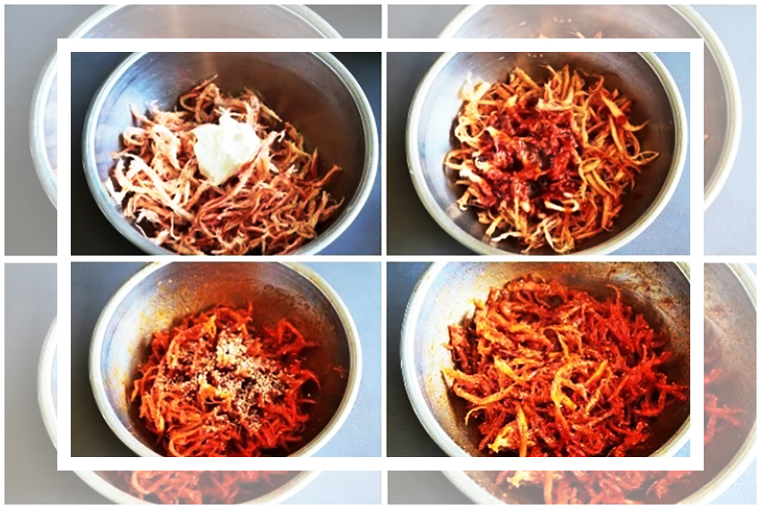 다 볶아진 진미채는 꺼내서 잠깐의 시간 동안 식혀준 다음 앞서 준비한 양념에 골고루 묻혀주면 된다. 다만 버무리는 과정에서 양념을 한꺼번에 넣고 버무리지 말고 조금씩 추가해가면서 버무려야 한다.