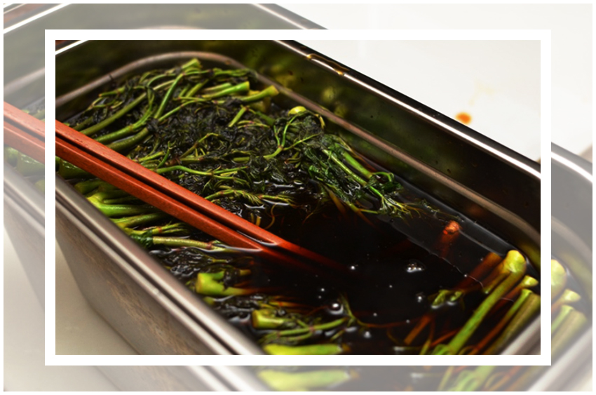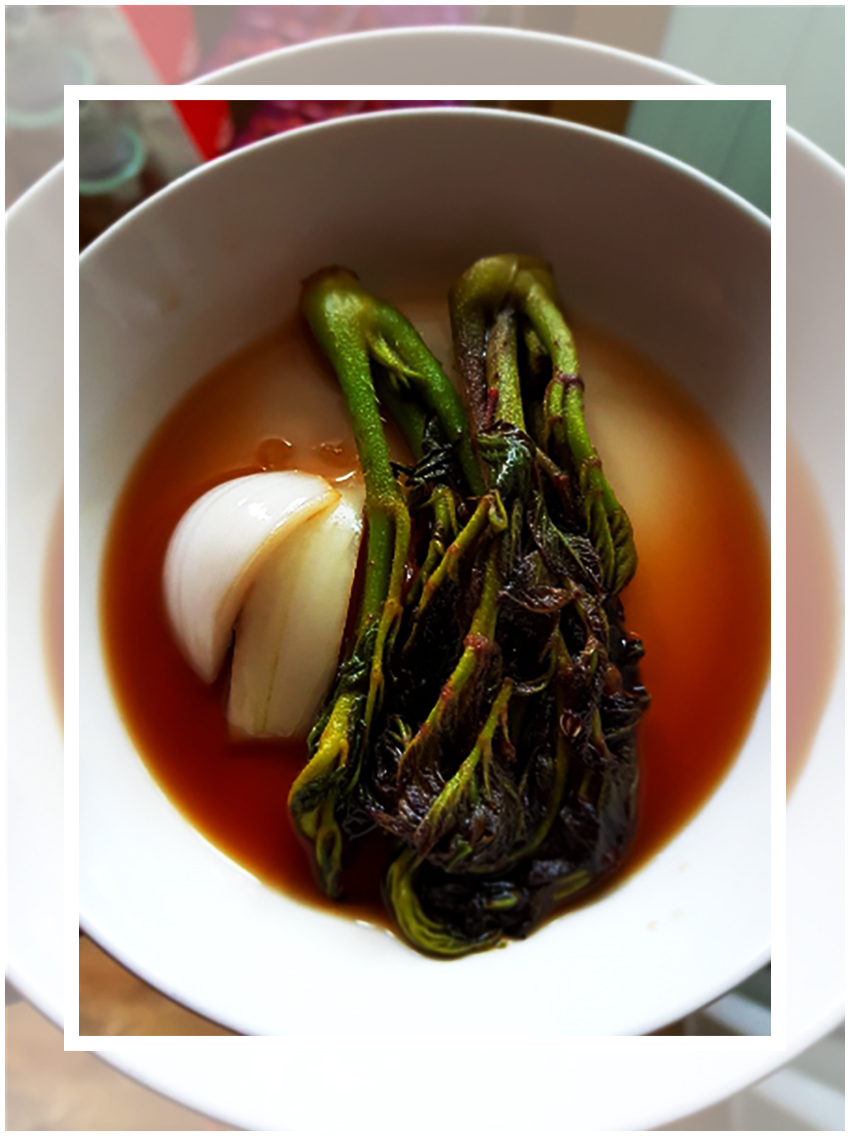 담금물까지 모두 준비가 되었다면 이제 두릅을 먼저 담을 용기에 차곡차곡 넣어주고 아직 식지 않은 담금물을 부어준다. 이때 두릅이 모두 잠길정도의 담금물을 준비해야 하며 수면 위로 떠오르는 두릅은 접시 등으로 받쳐 충분히 잠기도록 해준다.