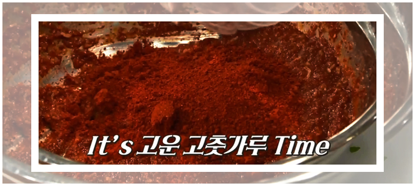 앞서 준비한 밀가루 풀과 꽃소금 2큰술, 새우젓 3큰술, 간 생강 1큰술, 멸치액젓 1/3컵, 간 마늘 1컵, 고춧가루 3컵을 넣어서 섞어준다. 이때 고춧가루를 가장 마지막에 넣는 것이 중요하다고 한다.