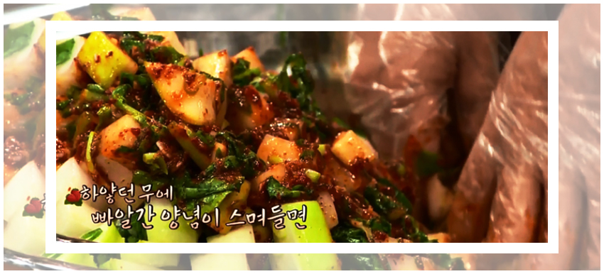 양념장까지 완성이 되었다면 앞서 20분간 절여뒀던 무와 함께 버무려서 백종원 깍두기 담그는 법을 마무리해주면 된다. 버무리는데 어떤 요령이 필요한 것도 아니다. 볼에서 절이던 그 상태 그대로 양념과 파, 열무를 넣고 버무려주기만 하면 된다.