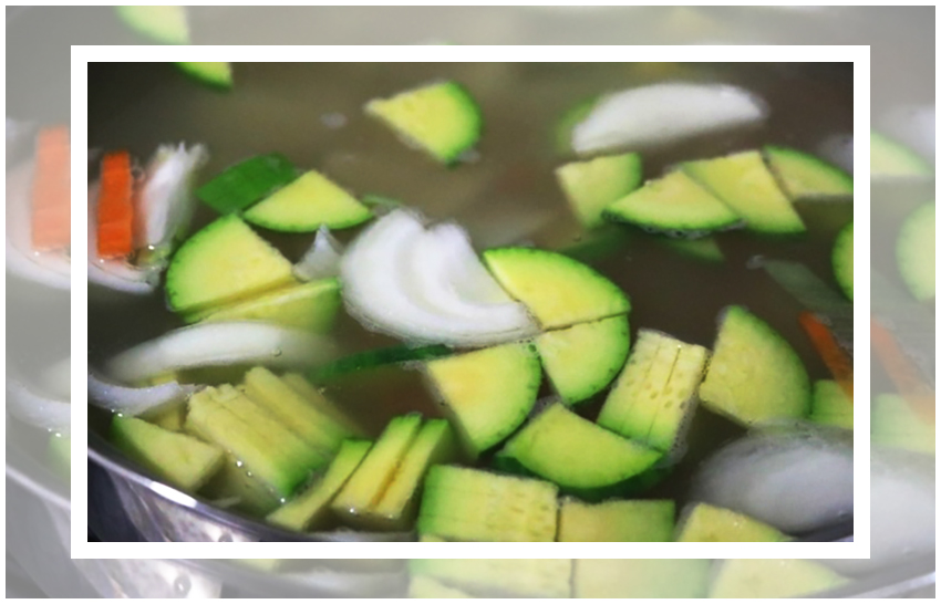 애호박도 마찬가지이다. 애호박은 껍질을 제거할 필요없이 바로 물에 세척해준다. 세척된 애호박은 세로로 길게 한번 반으로 썰고 그다음 얇게 썰어서 준비한다. 대파는 1대는 깨끗하게 세척한 다음 잘게 썰어서 준비한다. 너무 작을 필요는 없고 대충 듬성듬성 잘라주는 정도로 충분하다.
