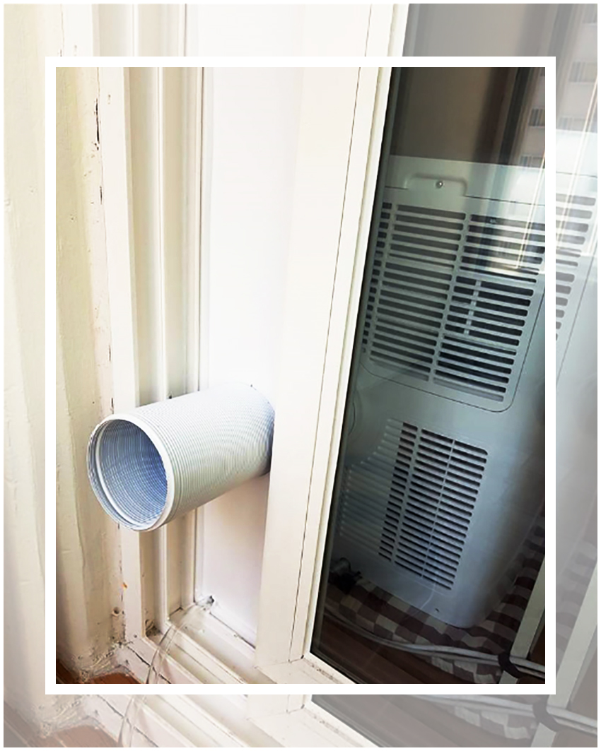이동식 에어컨은 그런 창문형 에어컨과 유사한 방식을 취하고 있다. 에어컨에 달려있는 배관을 창문에 고정하여 실외기의 필요성을 해결하는 형식이다. 이런 식의 형태이다 보니 창문만 있다면 어디서든 간단하게 에어컨을 사용할 수 있게 된다.