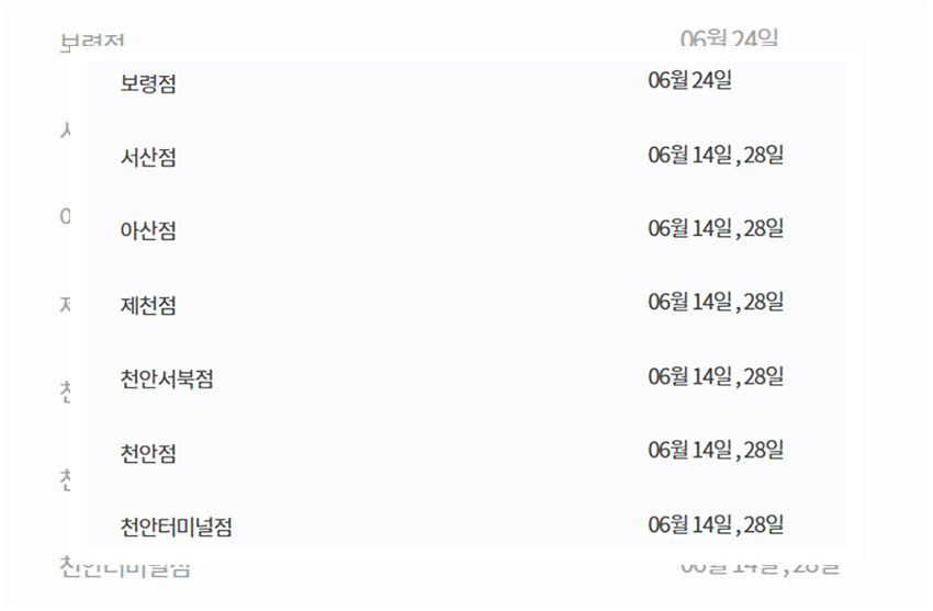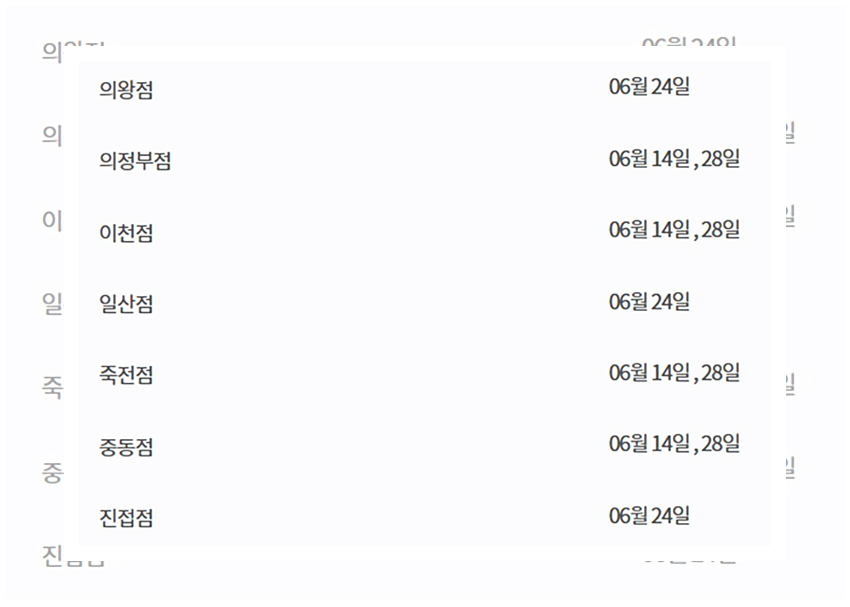 경기지역의 고잔점과 율산지역의 울산점이 해당하는데 고잔점과 울산점은 2주차 수요일가 4주차 일요일에 휴무일을 갖는다. 즉 6월 10일과 6월 28일에 휴무일을 갖는 것이다. 그런가 하면 강원지역의 강릉점은 2주차 수요일과 4주차 토요일인 6월 10일과 6월 27일에 휴무일을 갖는다.