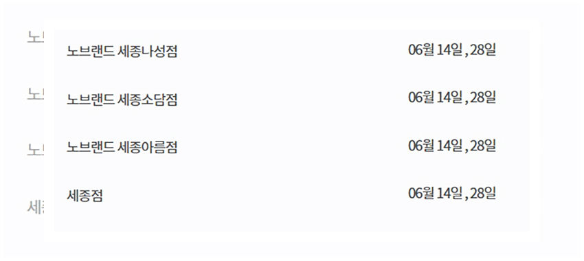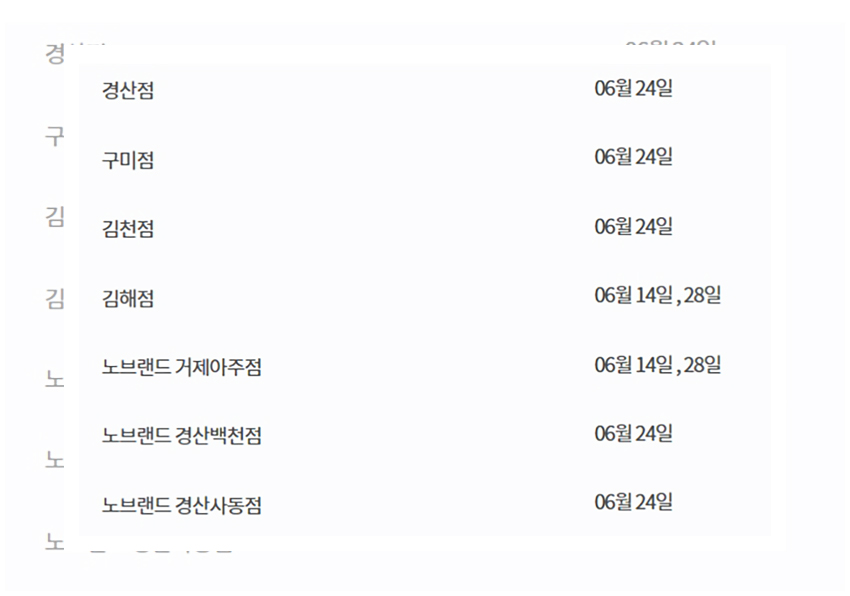 하지만 전부가 6월 14일과 6월 28일에 휴무일을 갖지는 않는다. 각 매장이 위치한 지역과 환경이 고려되어 어떤 매장은 2주차와 4주차 수요일에 혹은 월요일에 휴무일을 갖기도 한다. 그래서 해당글을 더욱 잘 살펴봐야 할 것이다.