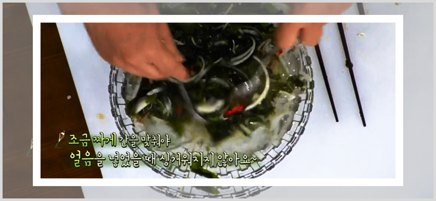 우선은 백종원 미역 오이냉국 만드는 법을 진행하기 위해서는 미역을 물에 불려줘야 한다. 여러 썰을 통해 알 수 있겠지만 미역의 경우 물에 불리게 되면 부피가 엄청나게 늘어나니 꼭 소량으로 준비해서 요리를 진행하기를 바란다. 불리는건 간단하다 소량의 미역을 물에 담가서 15분만 있으면 금방 불려진다. 물은 그냥 차가운 물보다는 적당히 미적지근한 물을 사용해주는 것이 좋다. 그렇게 불려진 미역은 찬물에 한차례 헹궈서 물기를 꾹 짜서 준비해주면 된다.