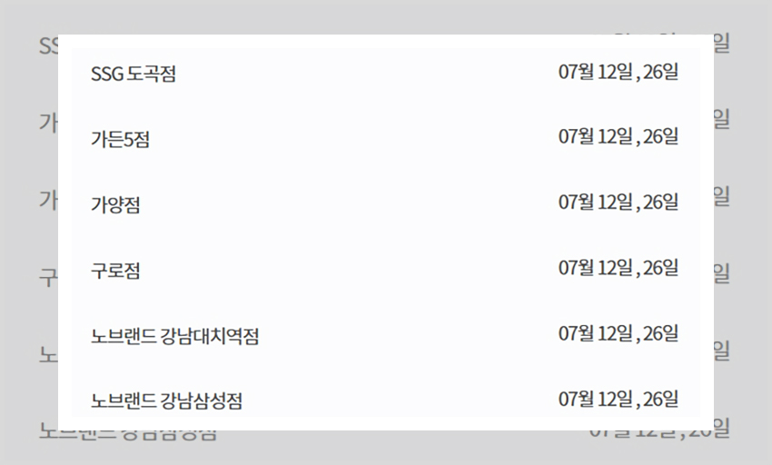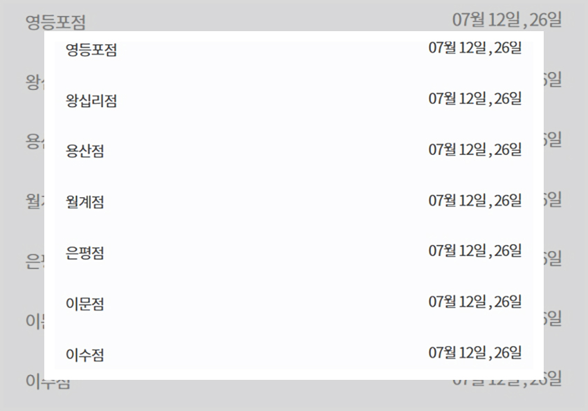 이마트 휴무일, 7월 12일 26일은 대부분의 대형마트들이 공통적으로 갖는 정기 휴무일이다. 그런만큼 많은 수의 매장이 해당 날짜에 휴무일을 갖는다. 서울지역의 경우 모든 매장이 7월 12일과 26일에 휴무일을 갖는다. 다만 경기지역에서는 경기 광주점, 고잔점, 광교점, 광명소하점, 광명점, 동백점, 동탄점, 보라점, 부천점, 분당점, 산본점, 서수원점, 성남점, 수원점, 수지점, 시화점, 용인점, 의정부점, 이천점, 죽전점, 중동점, 평택점, 화성 봉담점, 흥덕점 만이 해당 날짜에 휴무일을 갖는다. 대전/세종 지역, 대구지역, 광주지역, 전라지역, 부산지역 등은 모든 매장이 정기 휴무일 나라에 이마트 휴무일을 갖는다.