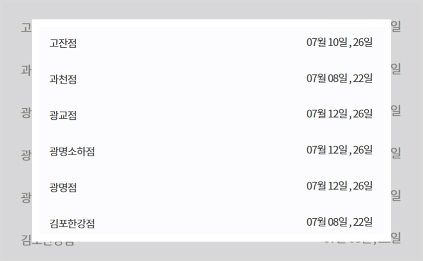 이마트 휴무일은 다른 대형마트들과 마찬가지로 정기 휴무일이 지정되어 있다. 바로 2주차와 4주 차 일요일이다. 7월의 날짜로 살펴보면 7월 12일과 26일이다. 이 정기 휴무일에 대부분의 이마트 매장들이 휴무일을 갖게 된다. 모든 매장이 공통적인 휴무일을 취했으면 좋겠지만 지역적 특성에 따라서, 행사 일정에 따라서 별도의 휴무일을 갖는 경우가 많다. 그러니 잘 확인해보고 헛걸음하는 일이 없기를 바란다.