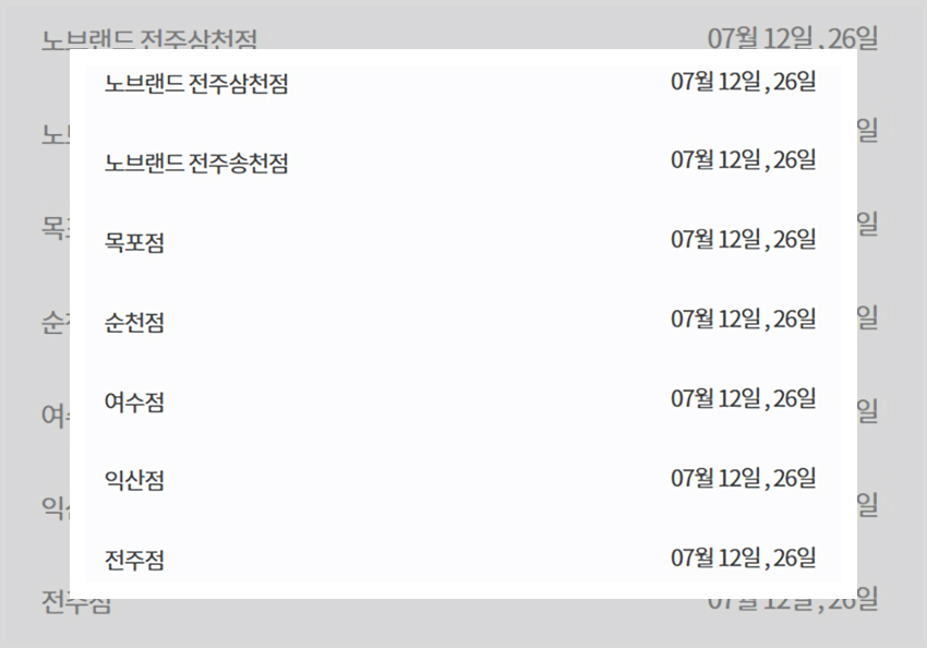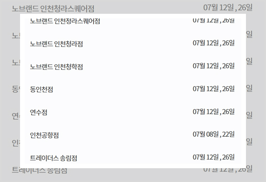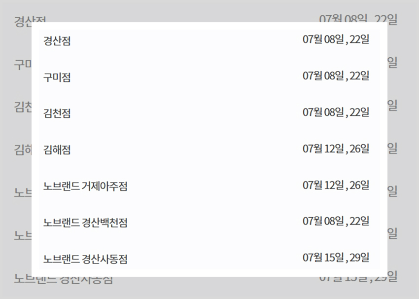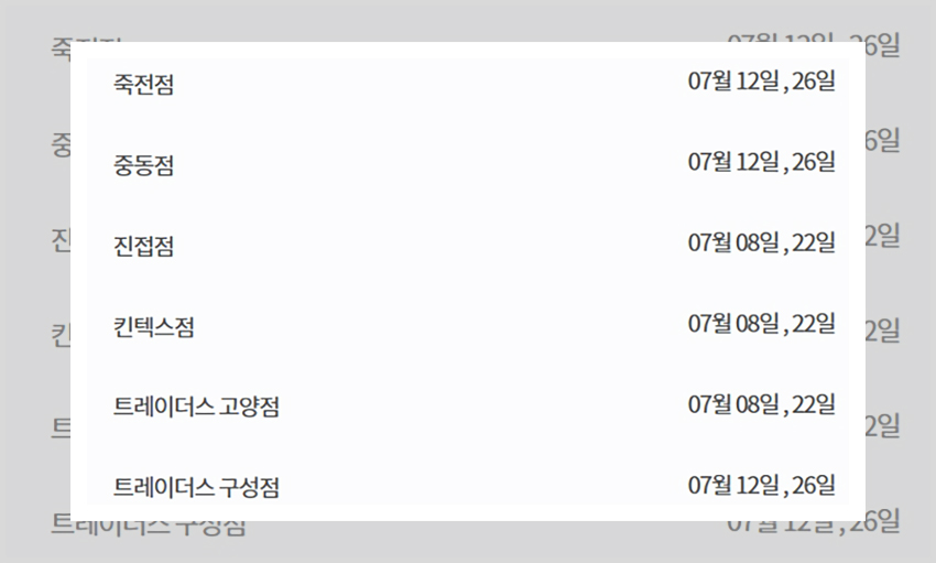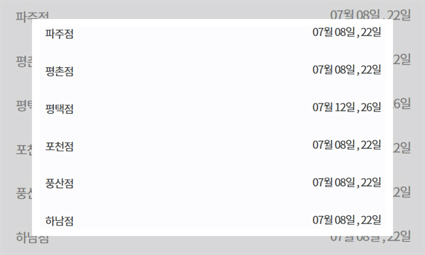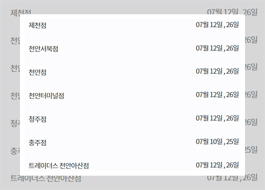 그런가 하면 아예 다른 이마트 휴무일을 갖는 매장들도 있다. 충청지역의 충주점은 그리고 제주지역의 이마트 매장들은 매월 동일하게 10일과 25일에 휴무일을 갖는다. 울산점의 경우는 2주차 수요일과 4주 차 일요일에 휴무일을 갖는다 7월 날짜로 살펴보면 7월 8일과 7월 26일에 휴무일을 갖는 것이다. 그러니 자신의 매장이 2주 차와 4주 차 일요일과 수요일 이외의 휴무일에 휴일을 갖지 않는지 꼭 살펴보길 바란다.