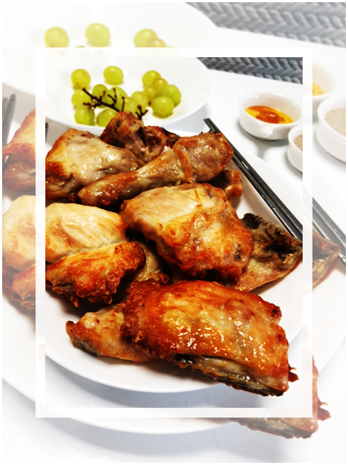 핏물 및 잡내제거에 30분, 마리네이드에 30분, 장장 1시간 동안의 재우는 과정이 완료되면 이제 굽는 일만 남았다. 에어프라이어에 마리네이드 된 닭은 가지런히 놓고 구워주면 된다. 온도는 180도로 맞추고 시간은 20분에 맞춰서 구워주면 된다.