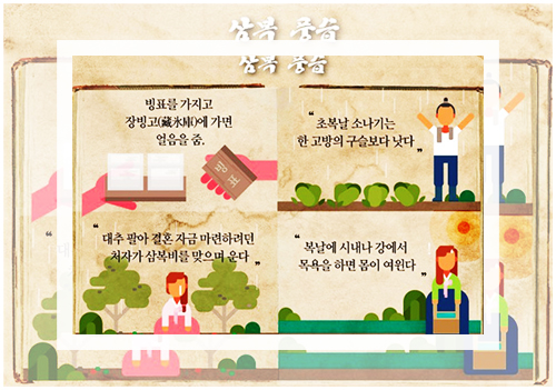 흔히 삼복, 복날 등으로 지칭되는 이 세 절기는 앞으로 찾아오는 무더위를 경계하는 의미를 가지고 있다. 오죽하면 삼복더위를 말하며 항상 땡볕더위라는 말이 따라붙겠는가.