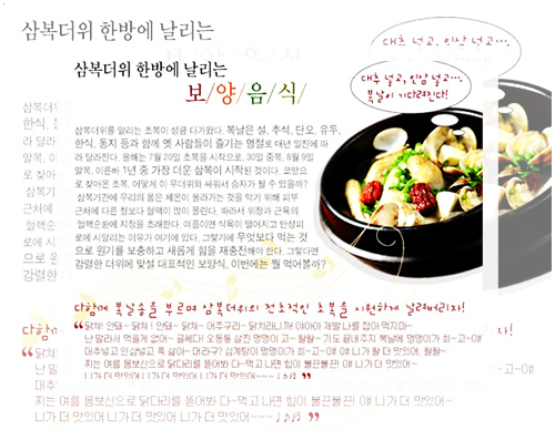 어찌 보면 삼복의 기간 동안 가장 반가운 단어는 ‘몸보신’ 일 것이다. 더위를 핑계로 맛있고 열량 높은 음식들을 죄책감 없이 즐길 수 있기 때문이다. 그리고 몸보신 음식 중에는 뜨거운 음식으로 이열치열을 즐기던 음식들이 대부분이다.