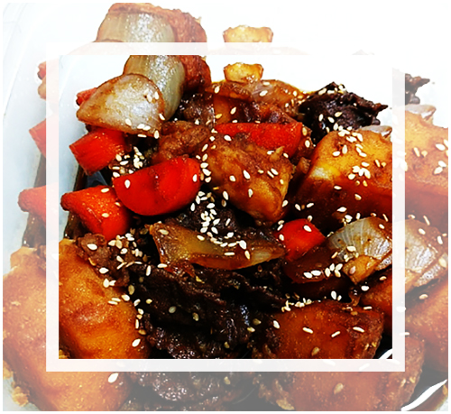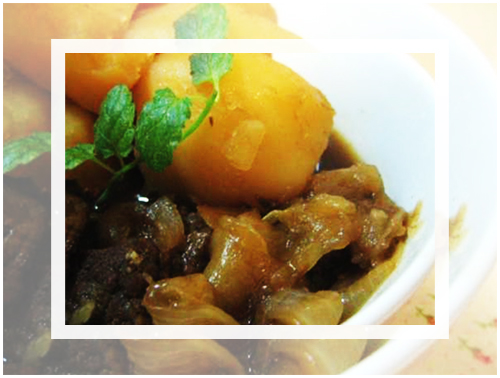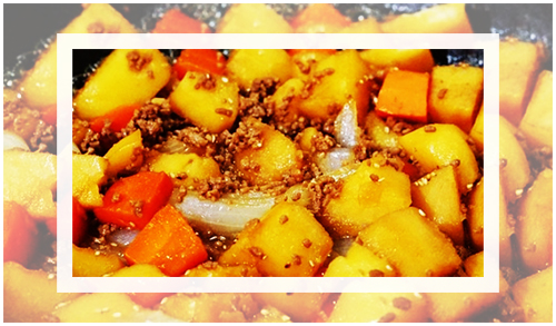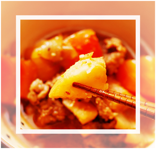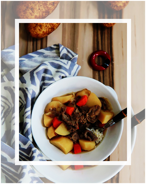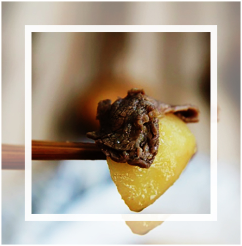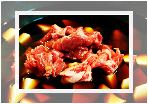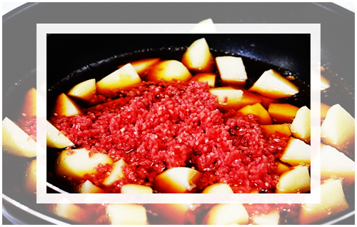 그러다가 설탕이 녹아 바닥에서 설탕의 자작거림이 거의 없다면 감자와 소불고기용 고기를 먼저 넣어서 강불에 한차례 끓여준다. 이때 끓어오르기 시작하면 불을 약불로 줄인다음 뚜껑을 덮어서 20분간 조리해준다.