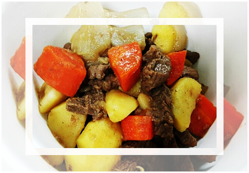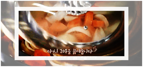 소고기와 감자만 들어간 상태로 20분간 끓여줬다면 뚜껑을 열고 다른 재료를 넣어준다. 감자와 비슷한 크기로 썰어놨던 당근과 양파를 넣어서 끓여주는 것이다.