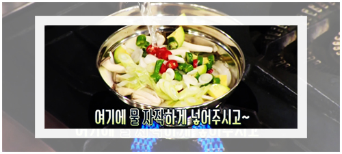 채소가 들어간 상태로 한차례 끓어오를 때까지 끓여준다. 끓어오르기 시작하면 국간장 2스푼을 넣어서 간을 맞춰준다. 물론 자신의 입맛에 맞게 국간장은 조절하면 된다. 그리고 이때 느타리버섯을 넣어주면 된다.