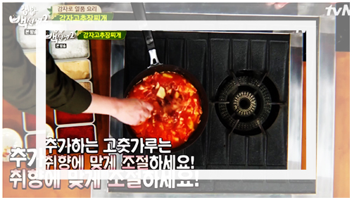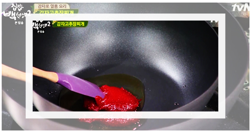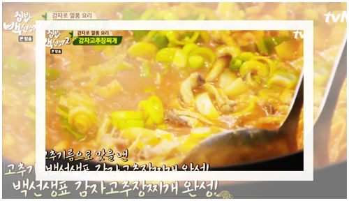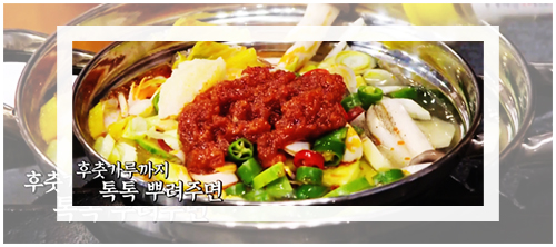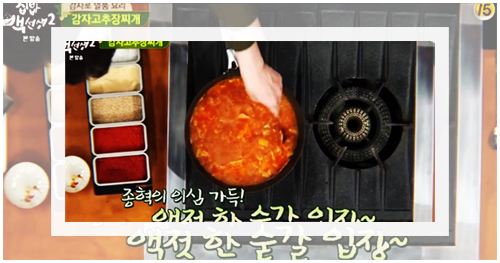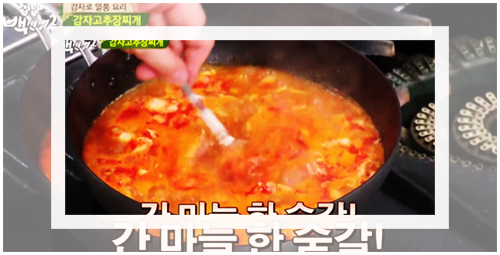 후추, 대파, 고추를 제외한 모든 재료가 들어간 고추장찌개는 이제 5분 정도 끓여준다. 5분 후 감자를 확인해서 어느 정도 익었다면 이제 여기에 남겨놨던 후추와 대파, 고추를 모두 넣고 1분가량 끓여주면 맛있는 백종원 고추장찌개가 완성된다. 맛있는 식사가 되길 바란다.