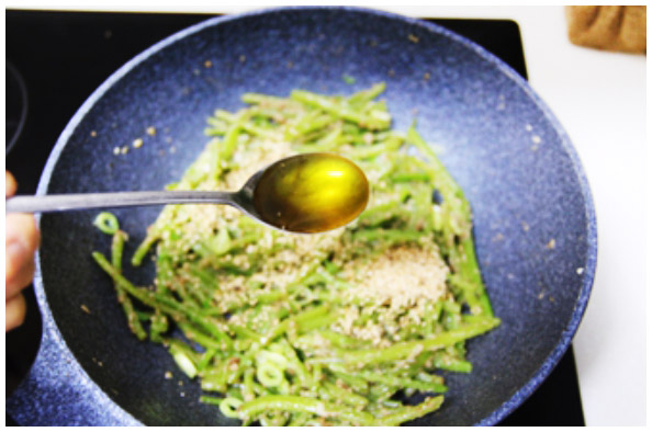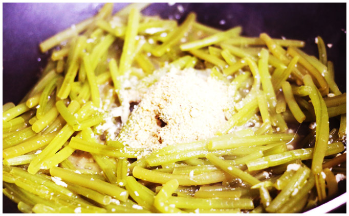 고구마줄기 볶음 6-1. 만약 통깨가 있다면 마지막으로 볶기전에 넣어서 볶아준다. 참기름이 있다면 함께 추가해주도록 하자.