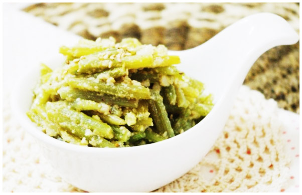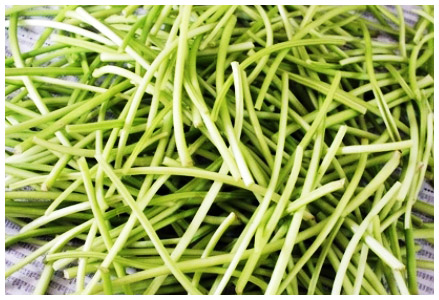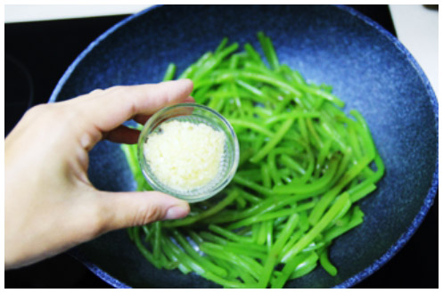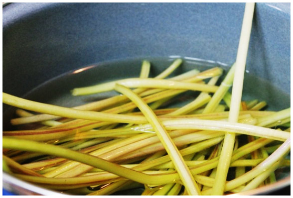고구마줄기 볶음 1-2. 데쳐주는 경우도 있는데 말린 고구마줄기가 아니라 생 고구마줄기일 때는 데쳐주는 것이다. 꿇는물에 1분정도 담궜다가 빼면 된다. 고구마줄기를 데칠 끓는물에 미리 소금 반스푼 정도를 넣어주면 고구마줄기에 간이 골고루 베게 되니 데치는 경우 소금을 넣어주도록 하자.