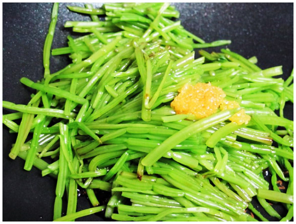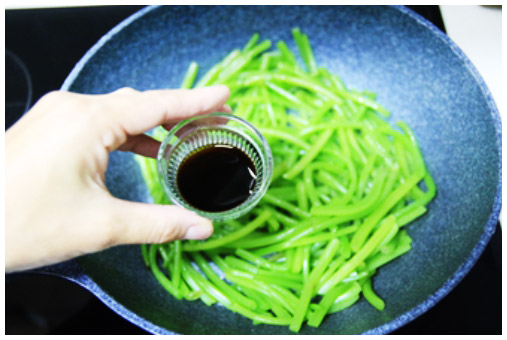 고구마줄기 볶음 4. 고구마줄기를 한차례 볶아줬다면 여기에 양념을 넣어주자. 양념이라고 해도 간장과 다진마늘이면 충분하다.