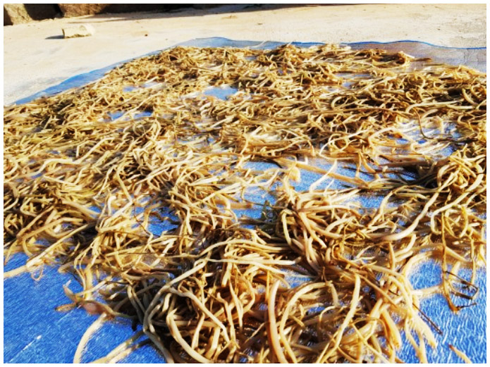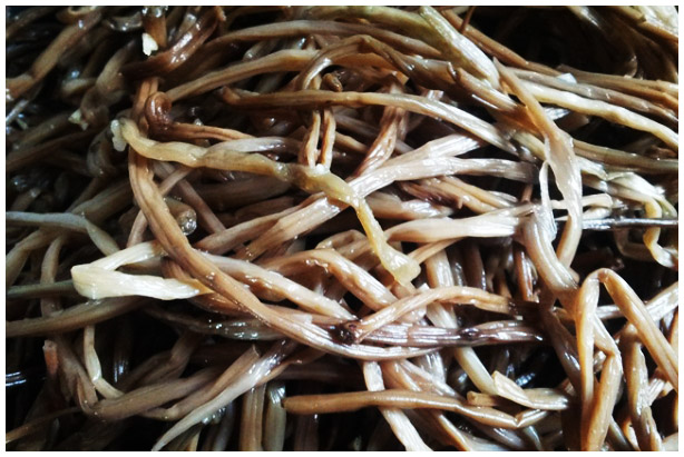 고구마줄기 볶음 1. 처음 구매한 고구마줄기는 기본적으로 말려있는 상태이다. 그러니 물에 10분동안 담가서 불려주면 된다.