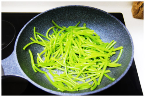 고구마줄기 볶음 3. 팬에 식용유 2스푼정도를 둘러서 고구마줄기를 우선 2분가량 볶아주도록 하자.