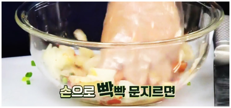 백종원 노각무침 6-1. 너무 세게 움켜쥐면서 물기를 짜면 오이가 으깨져 버린다 그러니 채반에 받쳐서 채반 쪽으로 꾹 누른다는 생각으로 물기를 짜주면 된다. 혹은 노각오이를 손바닥 위에 올려놓고 둥글게 반대 손으로 감싼 압착시키는 방법으로 물기를 제거해줘도 된다.
