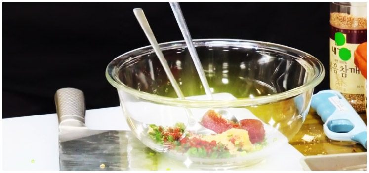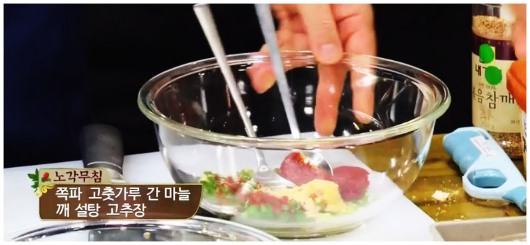 백종원 노각무침 5-2. 쪽파와 고추가 있고 넣고자 한다면 잘게 썰어서 양념에 넣어서 함께 섞어준다.