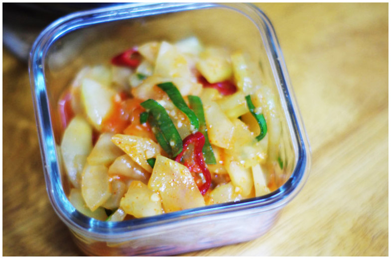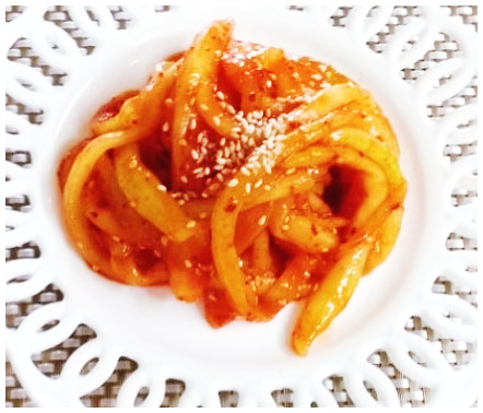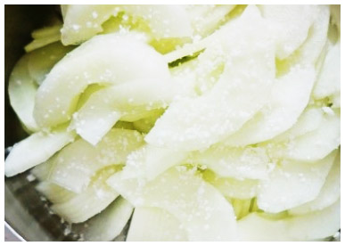 백종원 노각무침 7-1. 양파를 사용할 예정이라면 적당한 크기로 썰어서 이때 함께 버무려 주면 된다. 다만 노각 오이를 먼저 버무린 다음에 양파를 넣어서 버무려야 양파의 모양을 망가지지 않는다.