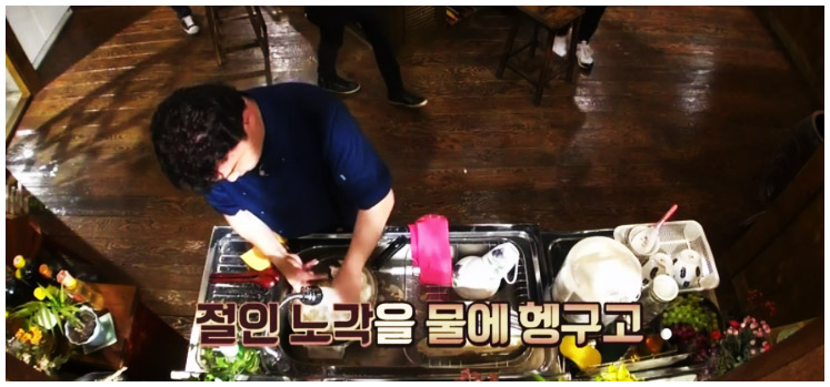 백종원 노각무침 6. 10분 동안 절여진 노각을 싱크대로 가져와 물에 한번 헹군 다음 손으로 꾹꾹 눌러 물기를 짜준다.