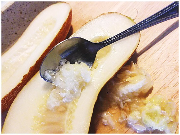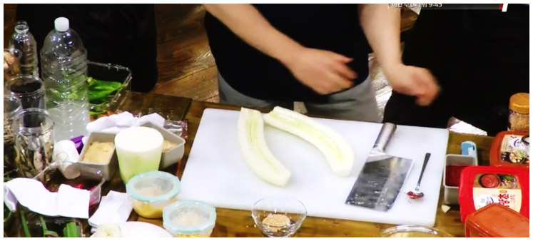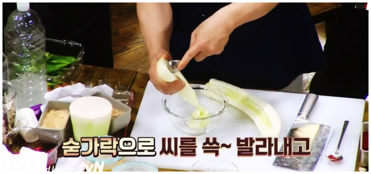 백종원 노각무침 2. 껍질을 벗겨낸 노각은 세로로 길게 반으로 잘라서 씨를 제거해 준다. 숟가락으로 쭉 긁어내 주면 간단하게 발라낼 수 있다.