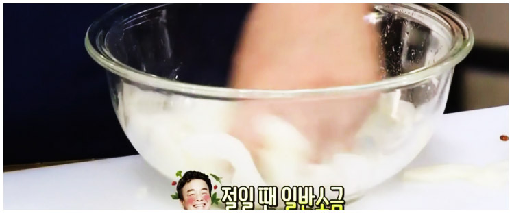 백종원 노각무침 4. 얇게 썰어놓은 노각은 볼에 담아 소금을 뿌려준다. 1~2꼬집만 뿌려준 다음 잘 섞기게 손으로 버무려준다. 그 후 10분가량 절여주면 된다.