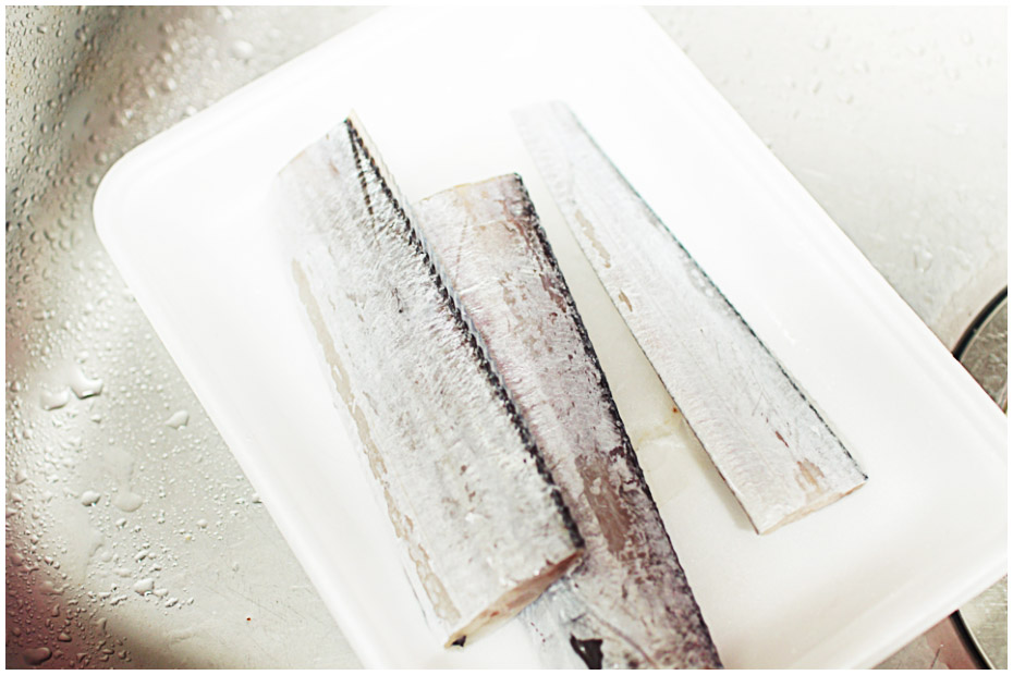 갈치조림 1. 갈치를 손질해주도록 하자. 일반적으로 시중에 판매되는 갈치들은 어느 정도 손질이 되어있다. 다만 혹시나 있을 잔여물을 확인하면서 흐르는 물에 헹궈내 주도록 하자. 내장 부분의 검은 막이 있는지 없는지를 확인하고 있다면 꼭 제거해주도록 하자.