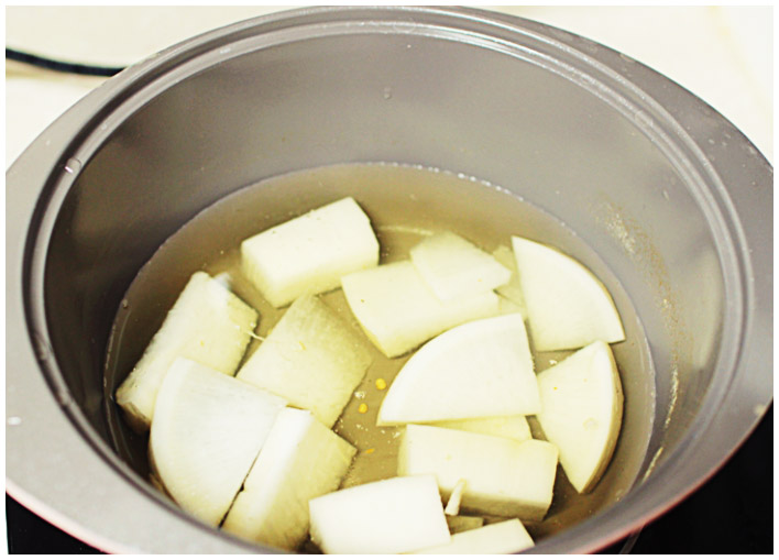 갈치조림 3. 무가 준비되었다면 물 2컵과 무를 냄비에 넣고 한차례 5분 정도 끓여주기 바란다.
