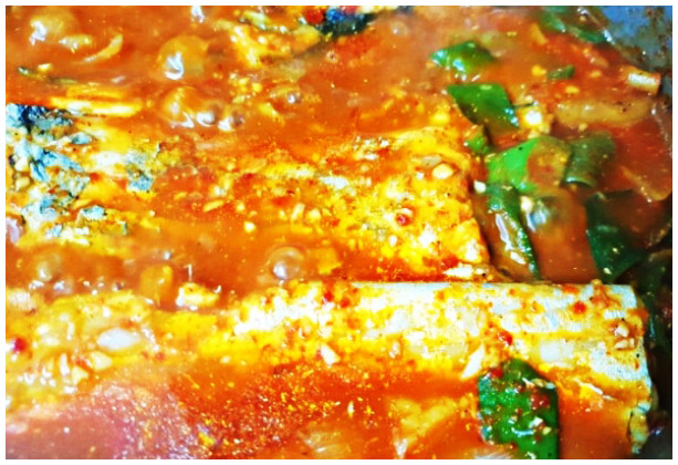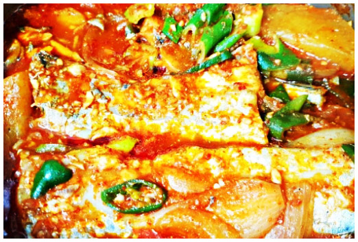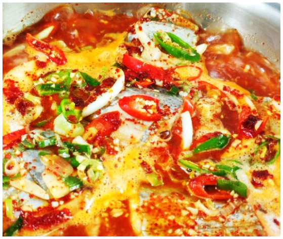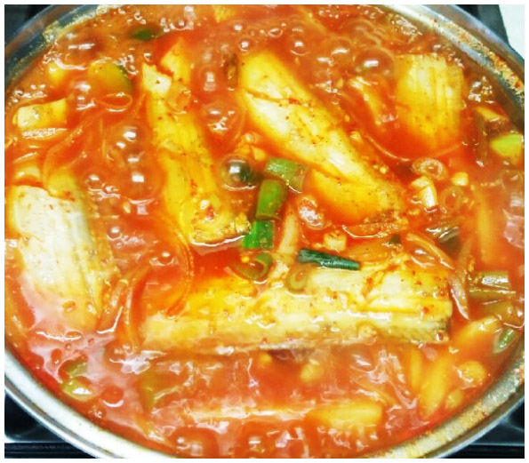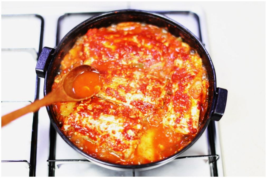 갈치조림 5. 한차례 더 끓여준다. 갈치와 각종 채소가 들어간 상태에서는 불을 중불 이하로 낮춰주고 끓여줘야 한다. 조리의 정도는 국물이 거의 남지 않고 무가 물러지는 정도까지 이다.