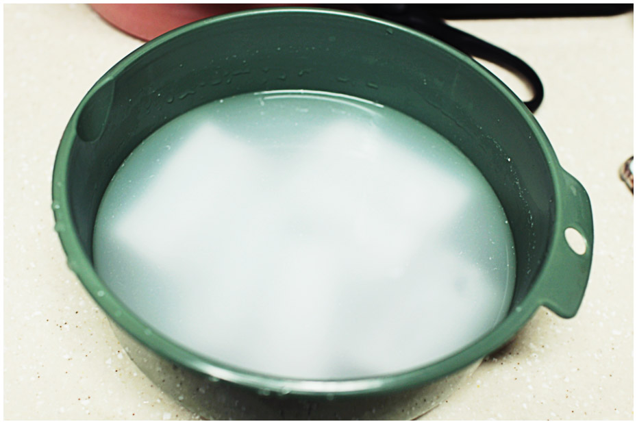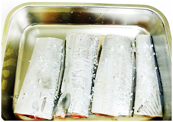 갈치조림 1-1. 손질이 완료된 갈치를 볼에 담아 쌀뜨물 1컵을 부어서 20분 정도만 놔두도록 하자. 비린내를 제거하는데 좋지만 다른 재료들을 통해서도 충분히 잡을 수 있으니 귀찮다면 생략해도 괜찮다.