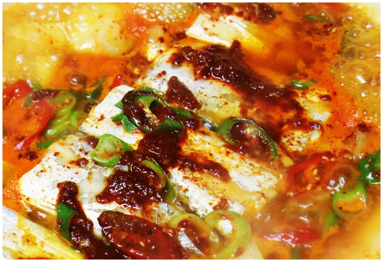 갈치조림 4. 육수가 푹 끓여줬다면 준비해둔 갈치조림 양념장 2스푼을 먼저 풀어준다. 국물에 양념이 충분히 풀어지면 갈치를 넣고 끓여주면 된다.